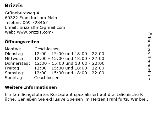 | Öffnungszeiten Brizzis in Frankfurt am Main anzeigen | |