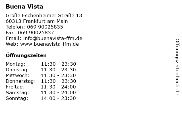 | Öffnungszeiten Buena Vista in Frankfurt am Main anzeigen | |