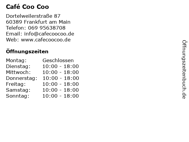 | Öffnungszeiten Café Coo Coo in Frankfurt am Main anzeigen | |