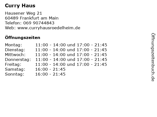 | Öffnungszeiten Curry Haus in Frankfurt am Main anzeigen | |