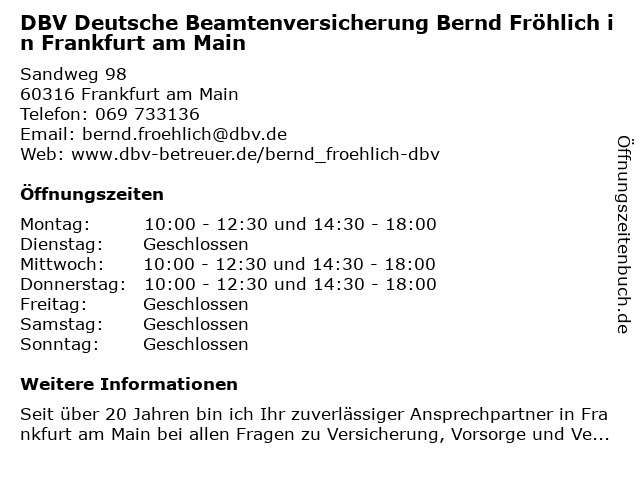 Branchen & Suchbegriffe zu DBV Deutsche Beamtenversicherung Bernd Fröhlich in Frankfurt am Main:autoversicherung, beamtenversicherung, bernd, berufshaftpflichtversicherung, berufsunfähigkeitsversicherung, dbv, deutsche, fröhlich, gebäude- und hausratsversicherung, lebensversicherung, main, unternehmen für versicherungsfachfragen, zahnmedizinische versicherung |