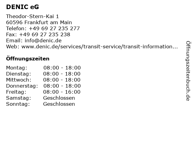 | Öffnungszeiten DENIC eG in Frankfurt am Main anzeigen | |
