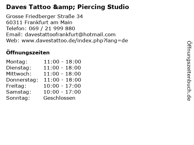 1 Tattoo & PIERCINGSTUDIO DAVE'S (Entfernung: 0,01 km) Große Friedbergerstr 34, 60313 Frankfurt Am Main 6 |