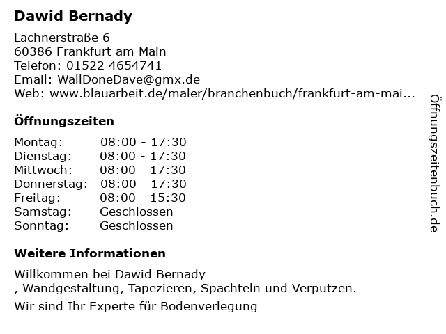 | Öffnungszeiten Dawid Bernady in Frankfurt am Main anzeigen | |