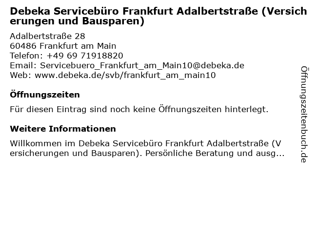 | Debeka Servicebüro Frankfurt Adalbertstraße (Versicherungen und Bausparen) anrufen | |