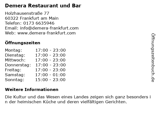2 Savanna | Afrikanisches Restaurant Frankfurt (Entfernung: 1,26 km) Alte Gasse 69, 60313 Frankfurt am Main 3 Erta Ale afrikanisches Restaurant (Entfernung: 2,12 km) Leipziger str. der eingang liegt in der rohmerstrasse 4 47, 60487 Frankfurt am Main 6 |