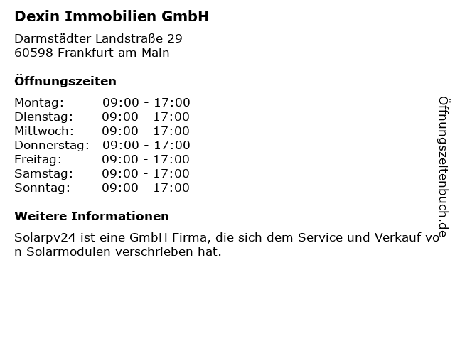 | Öffnungszeiten Dexin Immobilien GmbH in Frankfurt am Main anzeigen | |