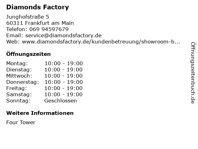 | Öffnungszeiten Diamonds Factory in Frankfurt am Main anzeigen | |