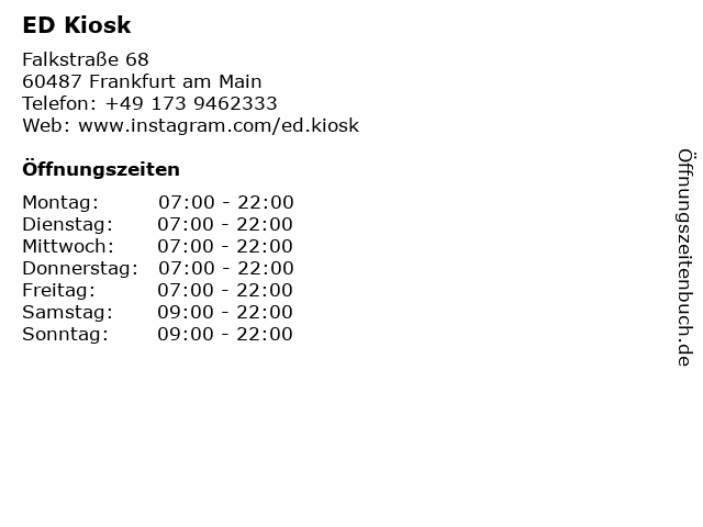 | Öffnungszeiten ED Kiosk in Frankfurt am Main anzeigen | |