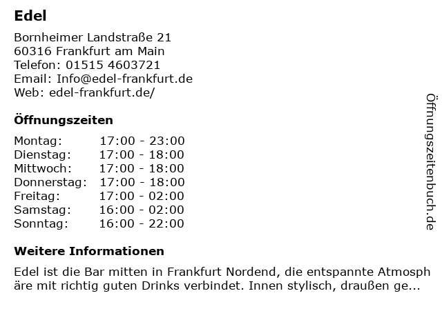 | Öffnungszeiten Edel in Frankfurt am Main anzeigen | |