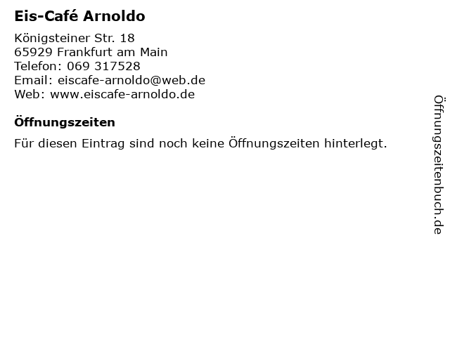 | Öffnungszeiten Eis-Café Arnoldo in Frankfurt am Main anzeigen | |