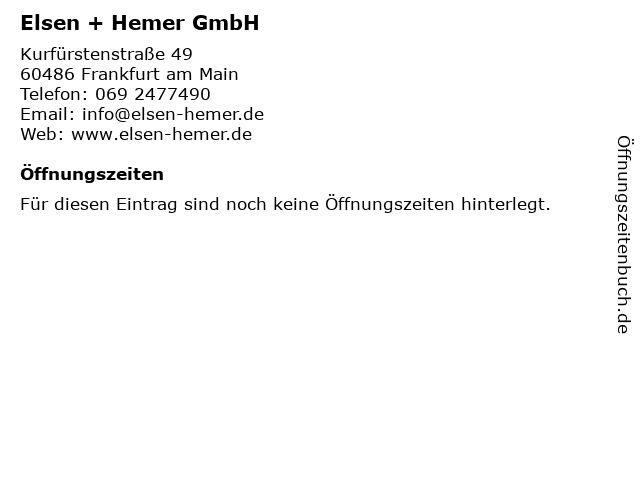 | Öffnungszeiten Elsen + Hemer GmbH in Frankfurt am Main anzeigen | |