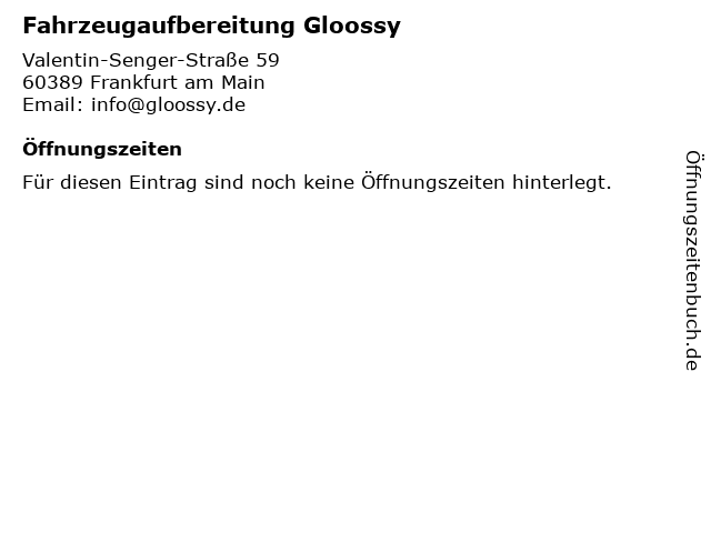 | Öffnungszeiten Fahrzeugaufbereitung Gloossy in Frankfurt am Main anzeigen | |