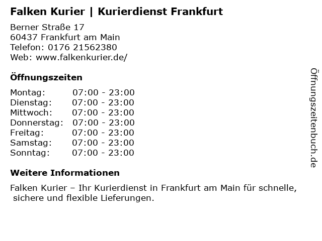 3 DAGO Kurierdienst Frankfurt (Entfernung: 8,09 km) Eschersheimer Landstraße 42, 60322 Frankfurt am Main 5 Allgemeine Bankboten und Kurierdienst GmbH (Entfernung: 10,09 km) Mannheimer Str. 97, 60327 Frankfurt am Main 6 |