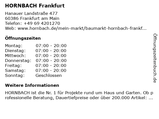 | Öffnungszeiten HORNBACH Frankfurt in Frankfurt am Main anzeigen | |
