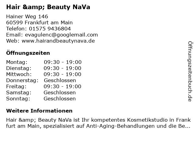 | Öffnungszeiten Hair & Beauty NaVa in Frankfurt am Main anzeigen | |