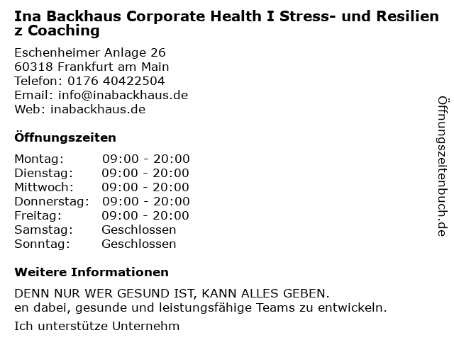 Branchen & Suchbegriffe zu Ina Backhaus Corporate Health I Stress- und Resilienz Coaching:backhaus, coaching, corporate, health, ina, resilienz, stress |
