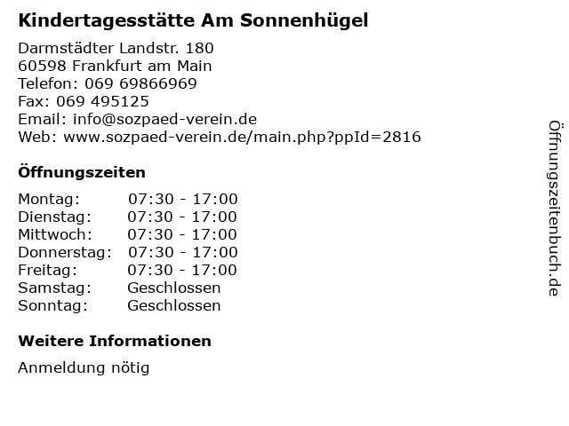 3 6 Kindertagesstätte Kindercampus - Betreuungszeiten (Entfernung: 0,13 km) Grethenweg 137, 60598 Frankfurt am Main |