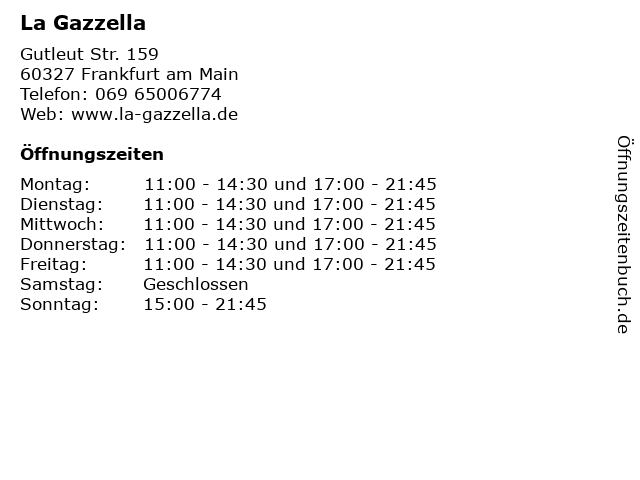| Öffnungszeiten La Gazzella in Frankfurt am Main anzeigen | |