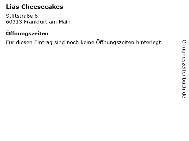 | Öffnungszeiten Lias Cheesecakes in Frankfurt am Main anzeigen | |