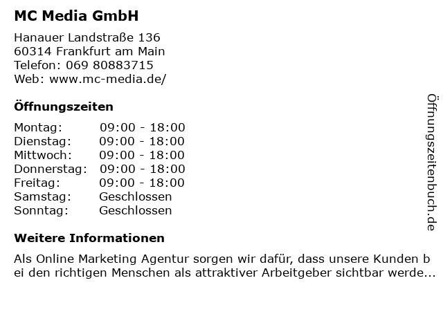 Öffnungszeiten MC Media GmbH in Frankfurt am Main anzeigen | |