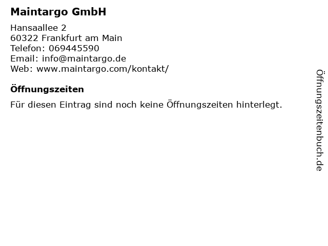 | Öffnungszeiten Maintargo GmbH in Frankfurt am Main anzeigen | |