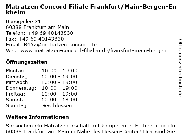 1 TÜV SÜD Service-Center Frankfurt-Bergen-Enkheim (Entfernung: 0,43 km) Edisonstraße 3, 60388 Frankfurt am Main 6 Matratzen Concord Filiale Offenbach am Main (Entfernung: 5,12 km) Mühlheimer Straße 325, 63075 Offenbach am Main |