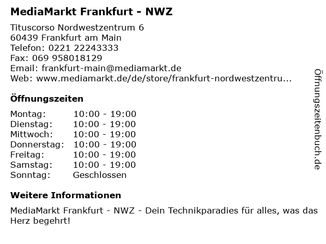 Branchen & Suchbegriffe zu MediaMarkt Frankfurt - NWZ:anbieter für telekommunikationsgeräte, computergeschäft, geschäft für handyzubehör, geschäft für heimaudiosysteme, geschäft für videospiele, handyreparaturgeschäft, haushaltsgeräte, mediamarkt, mobiltelefongeschäft, nwz |