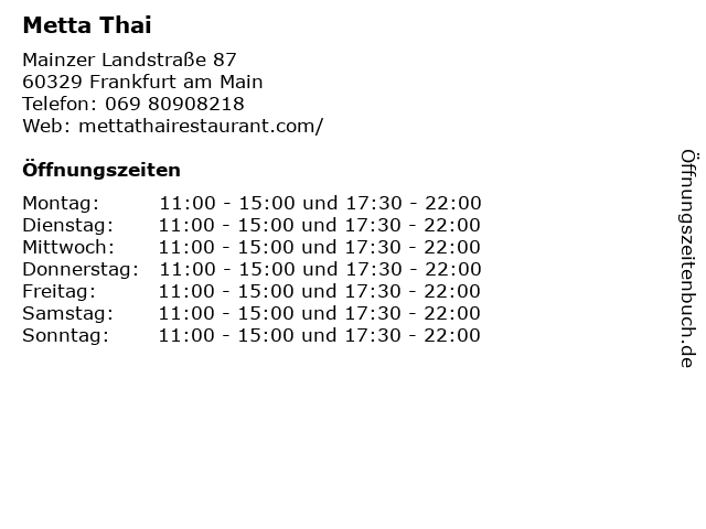 | Öffnungszeiten Metta Thai in Frankfurt am Main anzeigen | |