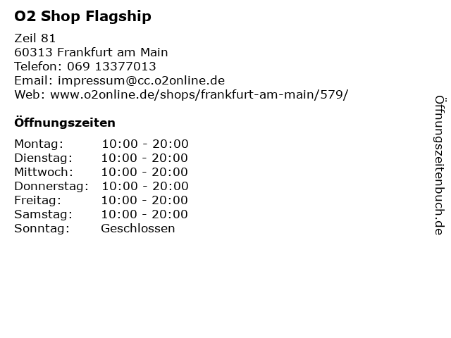| Öffnungszeiten O2 Shop Flagship in Frankfurt am Main anzeigen | |