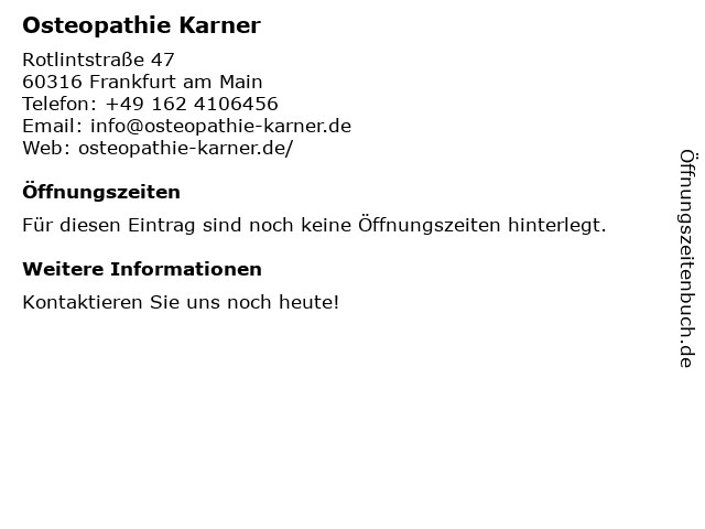 2 Osteoprax- Praxisgemeinschaft für Osteopathie in Frankfurt Jochen Frühwein Bürozeiten (Entfernung: 0,78 km) Wiesenstr. 34, 60385 Frankfurt am Main 4 Physiotherapie Osteopathie am Körnerdenkmal (Entfernung: 1,48 km) Auf der Körnerwiese 8, 60322 Frankfurt Am Main 5 sanftstark - Praxis für Osteopathie (Entfernung: 1,62 km) Carl-Theodor-Reiffenstein-Platz 6, 60313 Frankfurt 6 |