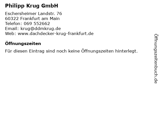 | Öffnungszeiten Philipp Krug GmbH in Frankfurt am Main anzeigen | |