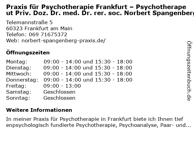 Branchen & Suchbegriffe zu Praxis für Psychotherapie Frankfurt – Psychotherapeut Priv. Doz. Dr. med. Dr. rer. soc. Norbert Spangenberg:doz., dr., familienberatung, frankfurt – psychotherapeut, med., norbert, praxis, priv., psychoanalyse, psychotherapie, rer., soc., ärzte |