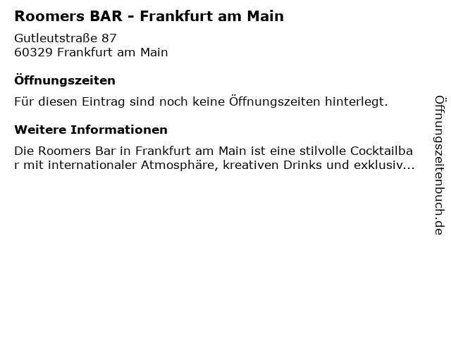 | Öffnungszeiten Roomers BAR - Frankfurt am Main in Frankfurt am Main anzeigen | |