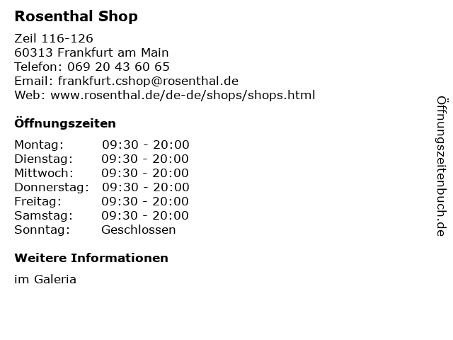 | Öffnungszeiten Rosenthal Shop in Frankfurt am Main anzeigen | |