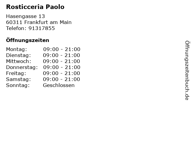 | Öffnungszeiten Rosticceria Paolo in Frankfurt am Main anzeigen | |