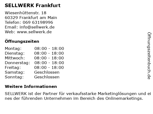 | Öffnungszeiten SELLWERK Frankfurt in Frankfurt am Main anzeigen | |