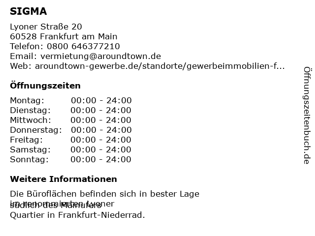 | Öffnungszeiten SIGMA in Frankfurt am Main anzeigen | |