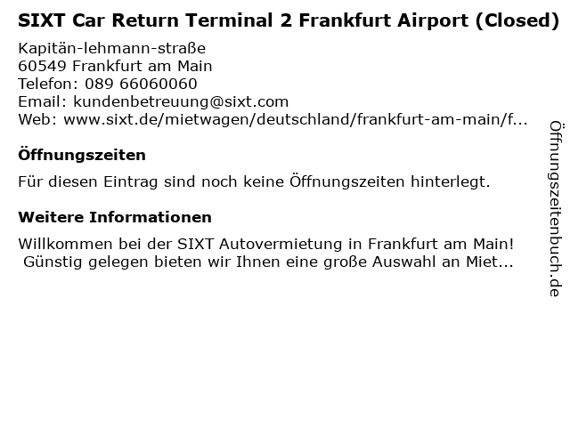 | SIXT Car Return Terminal 2 Frankfurt Airport (Closed) anrufen | |