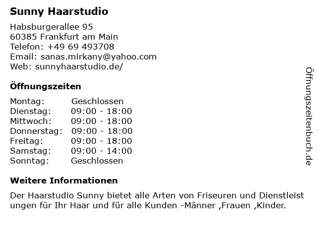 | Öffnungszeiten Sunny Haarstudio in Frankfurt am Main anzeigen | |