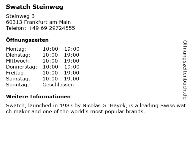 | Öffnungszeiten Swatch Steinweg in Frankfurt am Main anzeigen | |