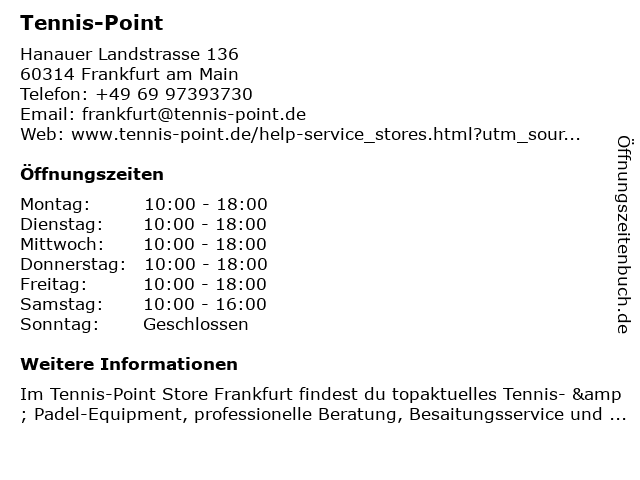 | Öffnungszeiten Tennis-Point in Frankfurt am Main anzeigen | |