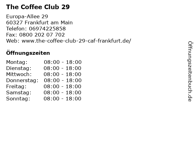 | Öffnungszeiten The Coffee Club 29 in Frankfurt am Main anzeigen | |