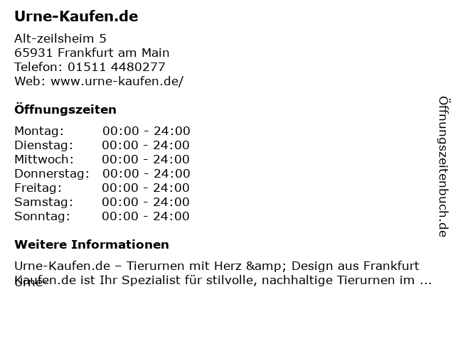 | Öffnungszeiten Urne-Kaufen.de in Frankfurt am Main anzeigen | |