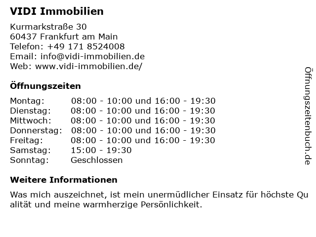 | Öffnungszeiten VIDI Immobilien in Frankfurt am Main anzeigen | |