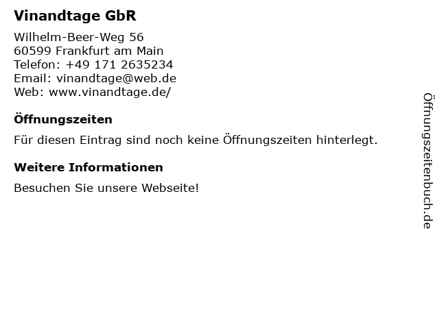 | Öffnungszeiten Vinandtage GbR in Frankfurt am Main anzeigen | |