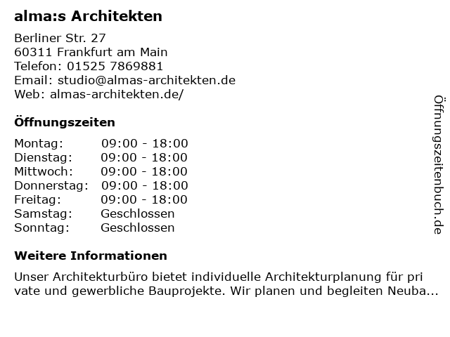 | Öffnungszeiten alma:s Architekten in Frankfurt am Main anzeigen | |