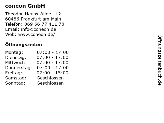 | Öffnungszeiten coneon GmbH in Frankfurt am Main anzeigen | |