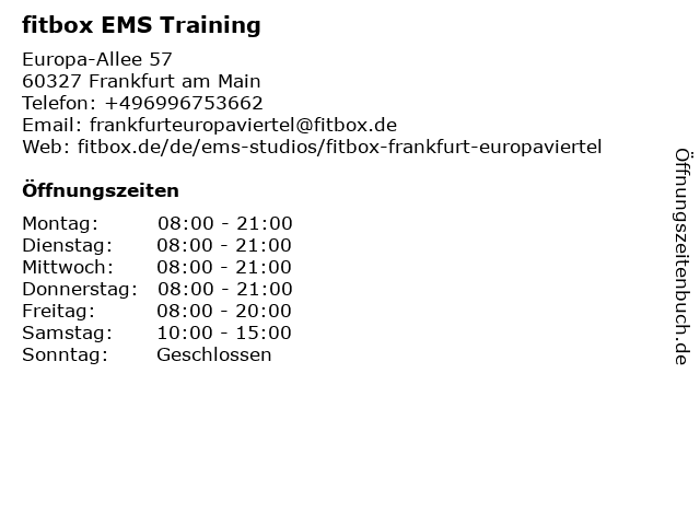 3 EMS Fitnessstudio fitbox - Frankfurt City (Entfernung: 2,28 km) Reuterweg 51-53, 60323 Frankfurt am Main 5 BODY STREET | Frankfurt Bornheim | EMS Training (Entfernung: 4,95 km) Im pruefling 26, 60389 Frankfurt am Main 6 |
