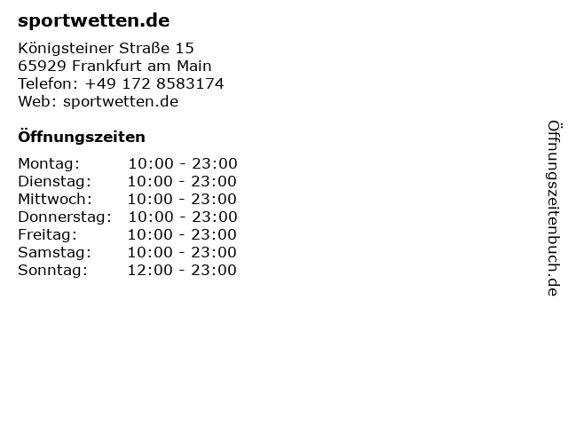 | Öffnungszeiten sportwetten.de in Frankfurt am Main anzeigen | |